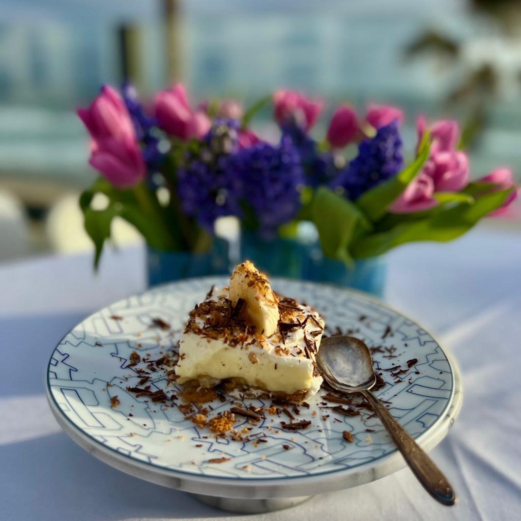 This is a delicious dessert and perfect to serve a crowd. You can cut up the squares in the kitchen, dress them up with all the toppings and serve to your guests. If you too with the bananas, place them on just before serving so they don’t brown. I normally make my own pudding, but it is very challenging to get a strong banana pudding flavor and the boxed banana pudding does the trick. I used mascarpone in the recipe to give the squares a little more structure. You could also substitute the same amount of cream cheese if that’s more available. You can make this dessert several hours ahead, and just add the droppings just before serving.