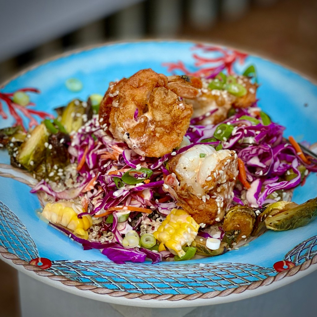 Toss the salad with prepared dressing. To serve, place a cup or so of quinoa on the plate. Top with asian slaw and place prepared shrimp on top. Drizzle mayo sauce on top along with sesame seeds and enjoy!