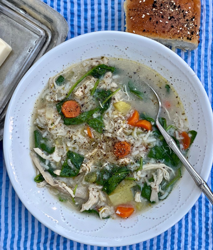 I created this recipe for my husband who was feeling a little puny after returning from an incredible weekend celebrating our daughter Chloe’s wedding. We came back from Santa Fe and he was severely exhausted and dehydrated and a chest cold started moving in. This is a mild soup but has all the elements required to restore health. As always, you have to start with a homemade stock for best results. I puréed a bit of the rice with the stock to provide a creamier base without the cream and create a natural thickness to the broth. I added some spinach for some extra nutrients.