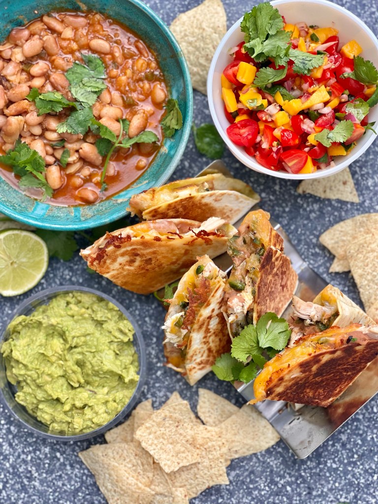 Love these beans as a complement to any Mexican food. They are so flavorful and leftovers are great the next day with eggs if you are lucky enough to have leftovers. I paired my beans with quesadillas but they are great with enchiladas and rice as well. I have suggestions for different chili options and this is mainly a function of how spicy you like your beans. The chipotle in adobo are the spiciest, but they add a nice smoky flavor. If you are wanting a vegetarian version, just eliminate the bacon and use olive oil. You don’t have to presoak your beans but it helps to reduce cooking time. I love to use stock over water as it enhances the flavor.