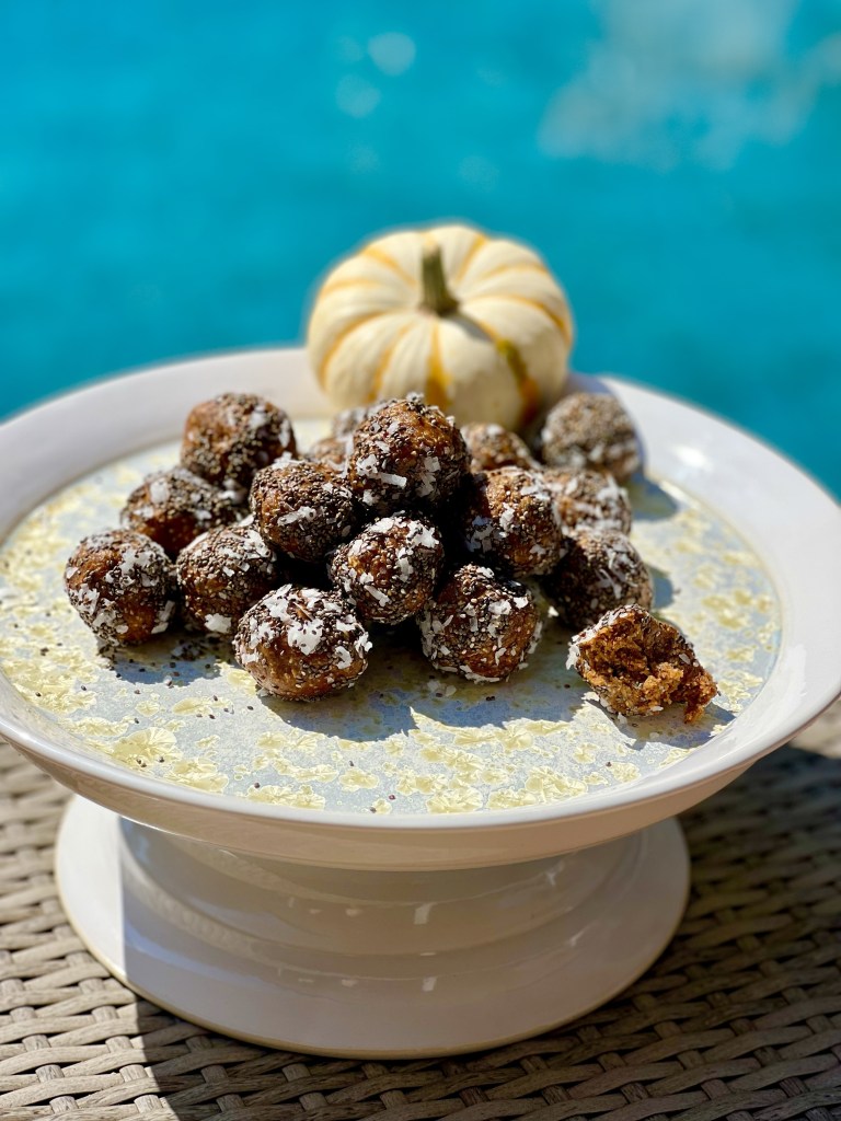 A seasonal vegan healthy snack that are nutritious and delicious when you are craving something a little sweet. They have the benefit of freezing beautifully as well. I like to add lots of pumpkin spice for extra fall flavor.