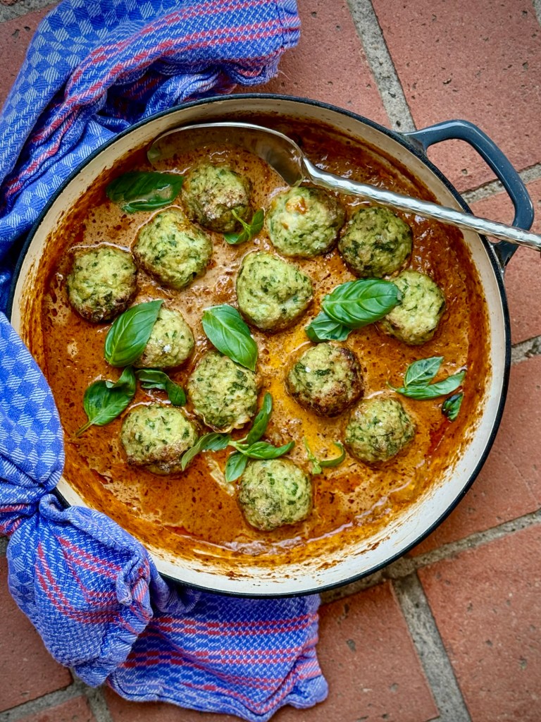 Love this quick and flavorful weeknight meal that can be pulled together easily. You can prep the chicken meatballs early in the day and then assemble the sauce quickly and serve with chicken or rice. It is tasty and easy and I love the use of the sun dried tomatoes as a base for the creamy sauce.