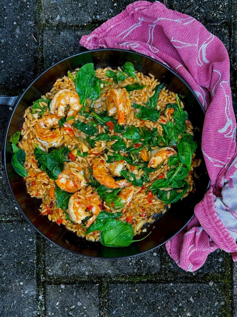 - Add butter to pan, along with onion, bell pepper, garlic and chili flakes to same skillet. Season with salt and pepper. Sauté until aromatic, about 3 minutes and turn the heat to medium high. Add in orzo and allow grains to toast for 1 to 2 minutes. Add white wine and broth, bring to a simmer until grains are al dente and most of liquid is absorbed (about 12 minutes).