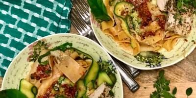 Pappardelle and Zucchini Ribbons with Roasted Red Bell Pepper Pesto and Buttermilk Oregano Chicken