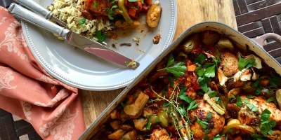 Greek Sheet Pan Chicken and Potatoes with Greek Style Okra, Feta and Tsatsiki