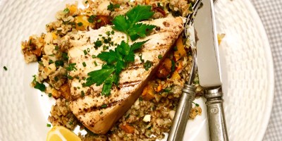 Grilled Swordfish on Roasted Butternut Squash – White Bean -Leek Bulgar Wheat Pilaf