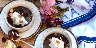 Chocolate Pots de Crème with Amaretto Cherries and Hazelnuts