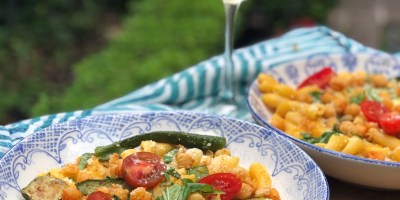 Pasta with Roasted Yellow Pepper Sauce, Baby Squash and Crispy Chickpeas