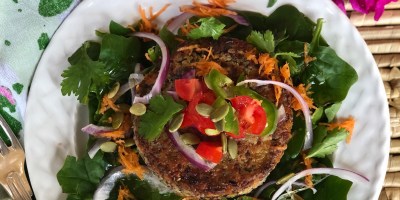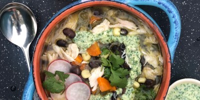 Roasted Cumin Brussel Sprout Tacos with Caramelized Corn Relish, Refried Black Beans and Salsa Verde
