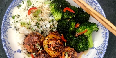 Asian Glazed Chicken Thighs with Broccolini, Red Peppers and Mushrooms