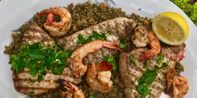 Grilled Tuna and Gulf Shrimp on French Lentils