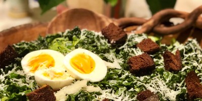 Lacinato and Kale Caesar with Manchego and Pumpernickel Croutons