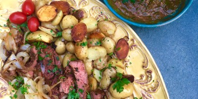 Main Course, Meat Skirt Steak with Roasted Tomato Chimichurri, Potatoes and Charred Onions October 29, 2016 — 1 Comment