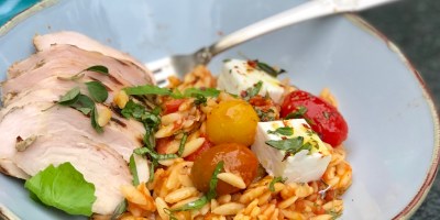 Buttery Tomato Orzo with Grilled Oregano Chicken and Marinated Feta