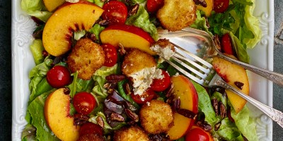 Salads, vegetarian Peach Tomato Salad with Fried Goat Cheese Medallions and Toasted Pecans September 2, 2020 — 0 Comments