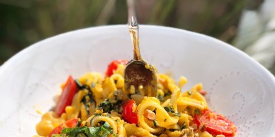 Creamy Roasted Garlic Butternut Squash Tagliatelle with Lacinato Kale, fresh tomatoes and Toasted Almonds